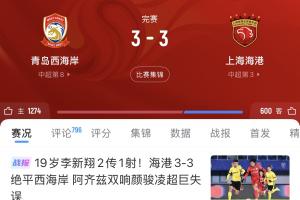 今日热点07月26日讯 中超第18轮,青岛西海岸客场2-2逼平上海海港,邵佳一带队本赛季两度战平海港(首回合主场3-3海港)。另外,本周中足协杯青岛西海岸120分钟2-2战平北京国安,点球遗憾告负。