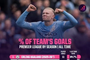 今日热点10月31日讯 Opta统计了球员单赛季英超进球在球队的占比,并列出榜单,本赛季哈兰德占比64.7%最高。
