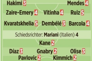 今日热点11月5日讯 巴黎在本轮欧冠焦点战主场1-2不敌拜仁,马尔基尼奥斯送礼、迪亚斯双响后染红,《图片报》在赛后为两队进行了评分:(1分最佳、5分最差,6分相当于负分)