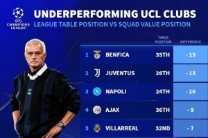 今日热点11月6日讯 德国转会市场根据球队目前欧冠排名与阵容身价排名的差距,列出了本赛季欧冠表现不佳球队榜,本菲卡、尤文最差。