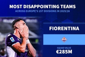 今日热点11月7日讯 德国转会市场根据球队的身价和目前的排名,列出了本赛季欧洲顶级联赛最令人失望球队,佛罗伦萨、纽卡、毕尔巴鄂竞技在列。