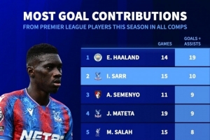 今日热点11月7日讯 德国转会市场统计了英超球员本赛季各赛事的参与进球数量,并列出榜单,哈兰德参与19球居首,萨尔参与10球次席。