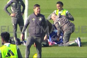 今日热点11月08日讯 西媒ElDesmarque放出了皇马训练的视频,米利唐受伤坐在水箱上,队医为他缠上绷带。阿隆索代替他上场完成了团队训练。