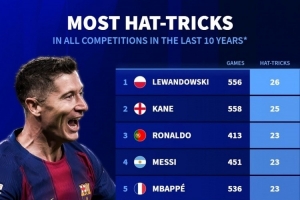 今日热点11月10日讯 德国转会市场统计了近10年前十联赛球员的戴帽次数,并列出榜单。
