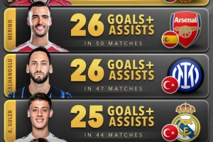 今日热点11月10日讯 Score90统计了2025年五大联赛中场球员在俱乐部+国家队比赛中参与进球的数量,并列出榜单。