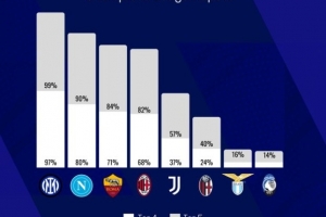 今日热点11月11日讯 意甲11轮比赛之后,国米、罗马同分位居前二,米兰和那不勒斯同样同分以两分之差位居三四位。Footballrankings对意甲球队闯进前五概率进行了预测,国米以99%位居榜首。