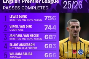 本赛季英超成功传球榜: