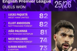 本赛季英超成功对抗榜:(次数相同,出场时间少者在前)