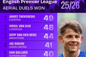 今日热点11月11日讯 英超联赛已经进行了11轮,squakwa也统计了本赛季英超空中成功对抗次数,塔科夫斯基力压范戴克居首。