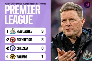 今日热点11月11日讯 Opta统计了本赛季英超球队领先之后丢掉的积分,并列出榜单,纽卡9分最多,布伦特福德、切尔西8分次席。