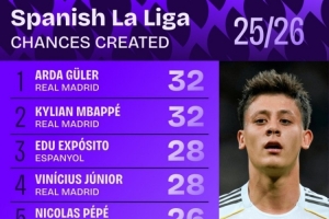 今日热点11月12日讯 Squawka统计本赛季西甲创造机会次数,居莱尔、姆巴佩32次最多。