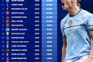 今日热点11月12日讯 德国转会市场盘点了英超各队历史身价最高球员,哈兰德以2亿欧居首,阿扎尔、凯恩、萨拉赫和萨卡均为1.5亿欧。