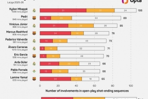 今日热点11月12日讯 据Opta统计,姆巴佩本赛季联赛参与106次以射门终结的进攻,西甲球员中最多。