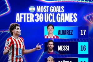 今日热点11月12日讯 欧冠官方统计了阿根廷球员前30场欧冠比赛的进球数量,并列出榜单,阿尔瓦雷斯17球居首,梅西16球次席。