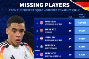 今日热点11月15日讯 德转列德国落选本次国家队名单的球员身价排行,穆西亚拉1.4亿欧居首,哈弗茨6000万欧第二,斯蒂勒4500万欧第三。