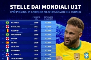 今日热点11月15日讯 德转列出了曾参加U17世界杯球员最高身价排名,内马尔1.8亿欧居首,斯特林1.6亿欧次席。