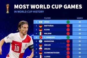 今日热点11月15日讯 克罗地亚获得世界杯参赛资格,莫德里奇将迎来第5届世界杯,德国转会市场统计了球员在世界杯的出场次数,并列出榜单,梅西26场居首,C罗22场、莫德里奇19场。