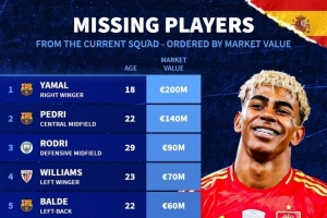 今日热点11月16日讯 德国转会市场统计了无缘本期西班牙队球员身价,并列出榜单,亚马尔2亿欧居首。