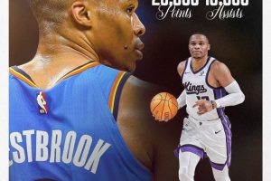 今日热点11月16日讯 在昨天NBA杯国王VS森林狼的比赛中,威少生涯总助攻数突破10000次大关,成为继詹姆斯之后,NBA历史第二位生涯取得25000分和10000助攻的球员。
