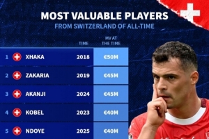 今日热点11月16日讯 日前,德国转会市场统计了瑞士球员历史最高身价排行,扎卡5000万欧居首。