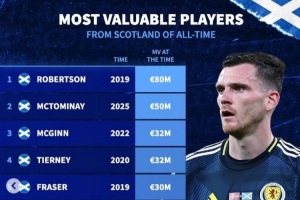 今日热点11月16日讯 德转统计苏格兰球员历史身价排行榜,2019年罗伯逊8000万欧居首,今年麦克托米奈5000万欧第二。