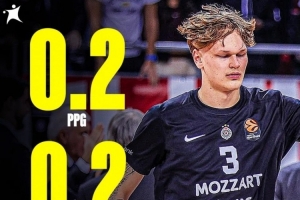 今日热点11月17日讯 明年的热门新秀穆里宁截止目前为止,在欧篮联只出场4次,场均出场时间仅为1分55秒,而他的场均数据可以忽略不计,4场比赛合计就得到1分,场均为0.25分,也没有篮板、助攻进账。
