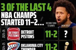 今日热点11月17日讯 活塞媒体Pistons Talk晒出了一个惊人的巧合数据,近4年的NBA总冠军中,有三支球队在当赛季开局都是11胜2负,唯有22-23赛季的掘金例外。