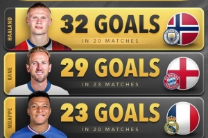 今日热点11月17日讯 Score90统计了本赛季五大联赛球员俱乐部+国家队的进球数量,并列出榜单,哈兰德32球居首,凯恩、姆巴佩二三位。