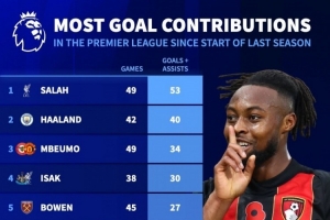 今日热点11月18日讯 德国转会市场统计了上赛季至今球员在英超参与进球的数量,并列出榜单,萨拉赫53球居首,哈兰德40球次席,姆伯莫34球第三。