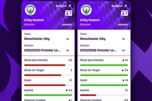 今日热点11月18日讯 Squawka统计了哈兰德22-23赛季(英超36球创纪录)和本赛季的数据,并做出对比。