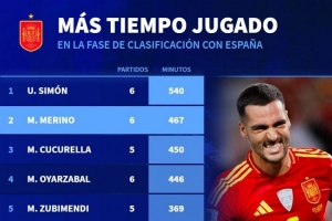 今日热点11月19日讯 德国转会市场统计了西班牙球员本届世预赛的出场时间,并列出榜单,门将西蒙540分钟居首,梅里诺467分钟非门将球员中最多。