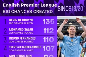 今日热点11月19日讯 Squawka统计了2019-2020赛季以来球员在英超创造重大机会的次数,并列出榜单,德布劳内、萨拉赫、B费排名前三位。