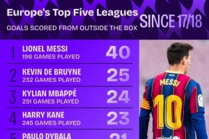 今日热点11月19日讯 Squawka统计了2017-2018赛季以来球员在五大联赛禁区外远射的进球数量,并列出榜单,梅西40球居首,德布劳内25球次席。