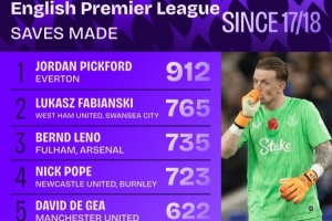 今日热点11月19日讯 Squawka统计17-18赛季至今英超门将扑救次数,皮克福德912次居首,法比安斯基第二。