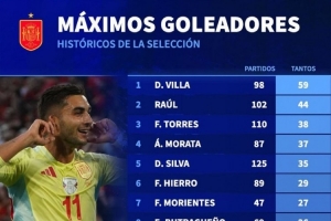 今日热点11月20日讯 德国转会市场列出西班牙队史射手榜,比利亚59球居首,费兰-托雷斯23球第10位,奥亚萨瓦尔打进22球。