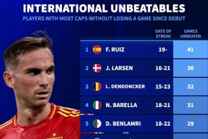 今日热点11月20日讯 德国转会市场统计了本世纪球员国家队首秀之后的连续不败场次数据,并列出榜单,法比安·鲁伊斯连续41场不败居首。