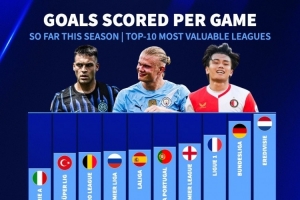 今日热点11月20日讯 德国转会市场统计了欧洲总身价前10联赛的场均进球数量,并列出榜单,荷甲3.36球居首,德甲、法甲二三位、意甲2.22球垫底。