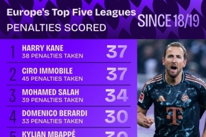 今日热点11月21日讯 Squawka统计了2018-2019赛季以来球员在五大联赛的点球进球数量,并列出榜单,凯恩、因莫比莱37球居首,萨拉赫34球第三。