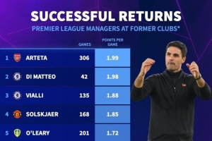 今日热点11月21日讯 德国转会市场统计了教练执教球员时代英超老东家的场均积分,并列出榜单,阿尔特塔1.99分居首,迪马特奥1.98分次席。