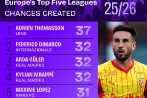 今日热点11月22日讯 五大联赛战火即将重燃,数据机构squakwa也统计了本赛季至今的五大联赛球员创造机会次数情况,朗斯中场阿德里安·托马森居首。