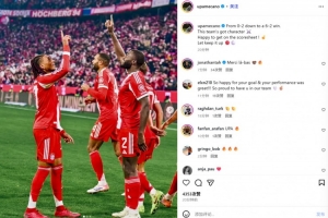 今日热点11月23日讯 拜仁在本轮德甲让二追六、成功逆转弗赖堡,于帕梅卡诺也斩获进球。